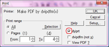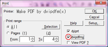 [File] -> [Dviprt] で、dvipdfmxにチェックを入れて印刷。PDFが作成できたら成功!