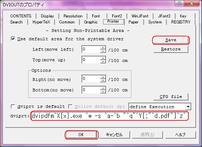 dvioutの [Option] -> [Setup Parameters] -> タブ[Printer] -> [dviprt:] 部分に、