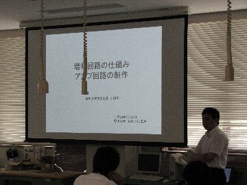 | 平成24年度 | 7月25日 | 受講者数 13名 (3年…5名 2年…6名 1年…2名) | 増幅回路の仕組み・アンプ回路の製作< 実施報告 アンケート結果 | 技術職員 吉田,立和名,澁谷 技術専門職員 松本 |