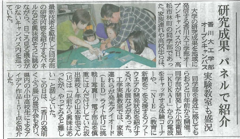 | 平成22年度より,本学で実施されますオープンキャンパスにあわせて一般の方が参加できる工作教室を開催しております. ※香川大学工学部 オープンキャンパスについてはこちら 実施実績 |