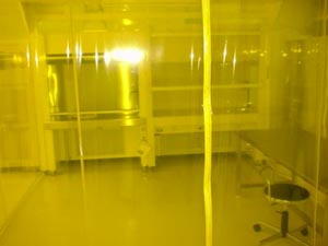 フォトリソグラフィができるようにイエロールームとしています.将来的にはここに反応性イオンエッチング装置と 蒸着装置を設置することを計画しています.この部分への入室の際は,クリーンルーム用簡易無塵服を必ず着用してください.