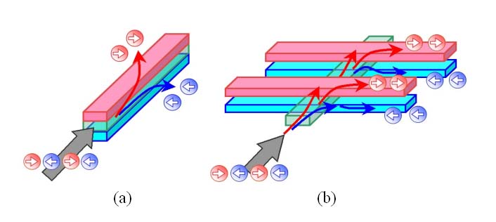 (a) 電流が流れている間のみスピン流が発生 (b) 異方性の付与により電流で磁性を制御
