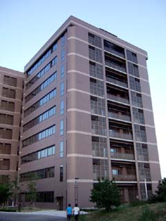 工学部2号館の西側に9階建ての総合研究棟(6号館)が完成し、材料創造工学科のある2号館と繋がりました。