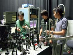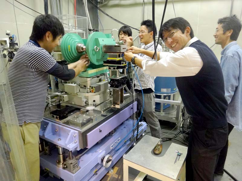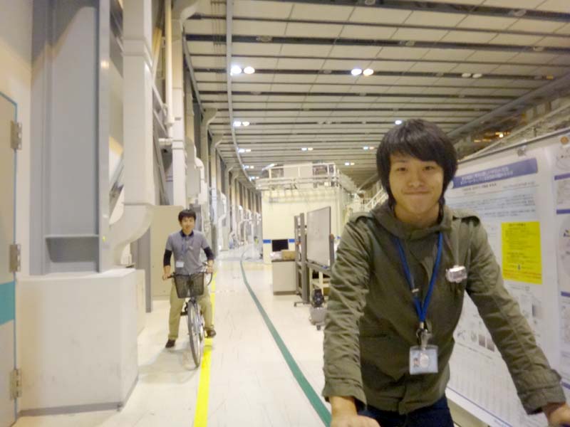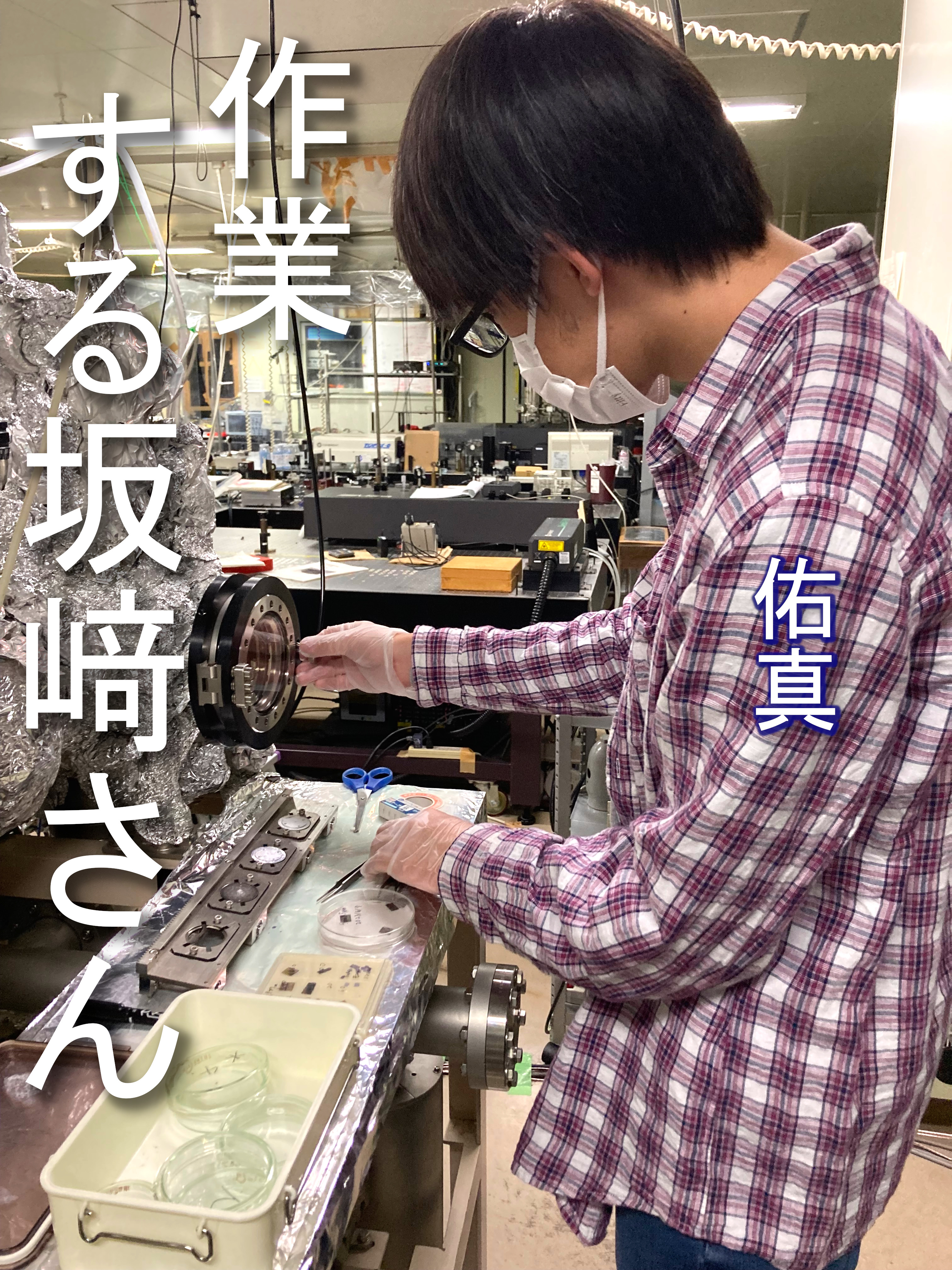 ↑写真は、PL実験のアライメントをする森くん(右)と竹村くん(左)