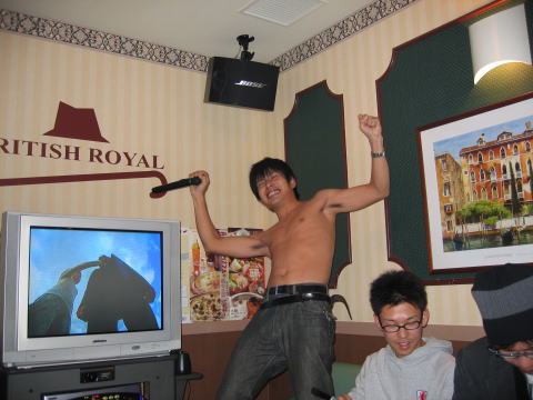 2004/12/21 忘年会 えいちゃんは酔うと脱ぎます.筋肉少女帯を歌っているところです.