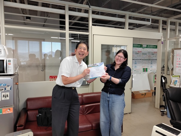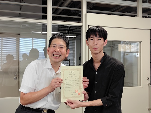 令和7年8月6日、高田さんが、学長から『学業優秀者賞』を受賞しました。高田さんは、研究室の過去の先輩方に憧れ、先輩方の背中を追い続けてきただけだと言っています。今後は、また誰かが、高田さんの背中を追い続けてくれるものと期待しております。